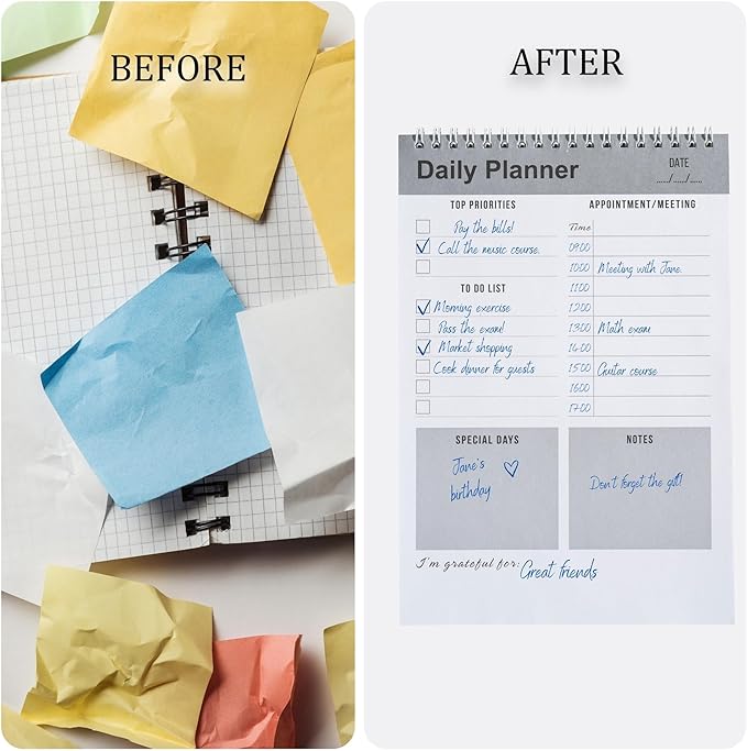 - PRACTICAL AND EASY: It is the perfect daily planner notebook for people who find digital planners complicated. It is a notepad to help you finish your work on time and organize your day. It is easy to use with its minimalist design. You will be more motivated to start your day with five color options.