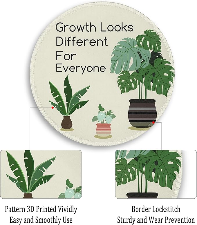 - Funny and Inspirational Design: This cute round mouse pad features a unique and humorous design that is sure to bring a smile to your face. The combination of green plants and the inspiring message "Growth Looks Different For Everyone" creates a positive and uplifting atmosphere in your workspace