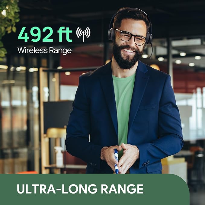- 492 ft Longer Range: Advanced DECT tech delivers an impressive wireless range of 492 feet. DECT wireless headset have higher call security, greater anti-interference, and 2x deployment density of Bluetooth