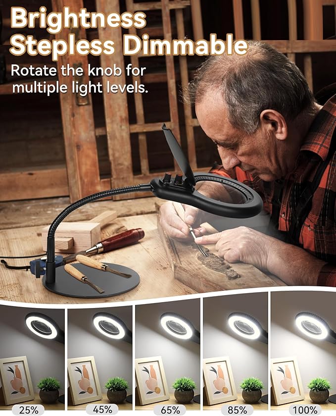- [Adjustable Lighting Design]: This lighted magnifier with light hands free is equipped with mechanical knob design, you can easily adjust the light brightness and color temperature through the two knobs on the lamp head, supporting 10%-100% brightness adjustment and 3200K-6000K color temperature change, creating any combination of light color patterns, breaking the traditional three-color or five-color light limitations, meeting your diverse needs for office lighting.