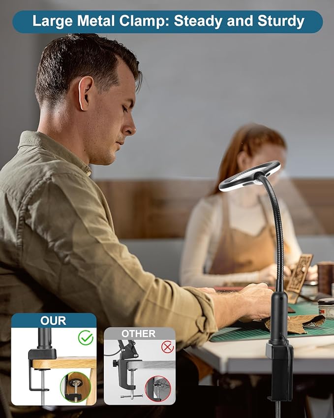 - Goose Neck Button Design: The gooseneck includes a button control for easy adjustment of 5 color modes and step-less dimming of brightness, unlike standard magnifying lamps that have their switches on the power cord.