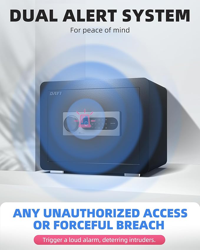 • DUAL ALERT SYSTEM FOR PEACE OF MIND - Featuring a dual alarm warning system, the DAYI home safe ensure your belongings are protected. Any unauthorized access or forceful breach triggers a loud 70-decibel alarm, effectively deterring intruders and providing heightened security.