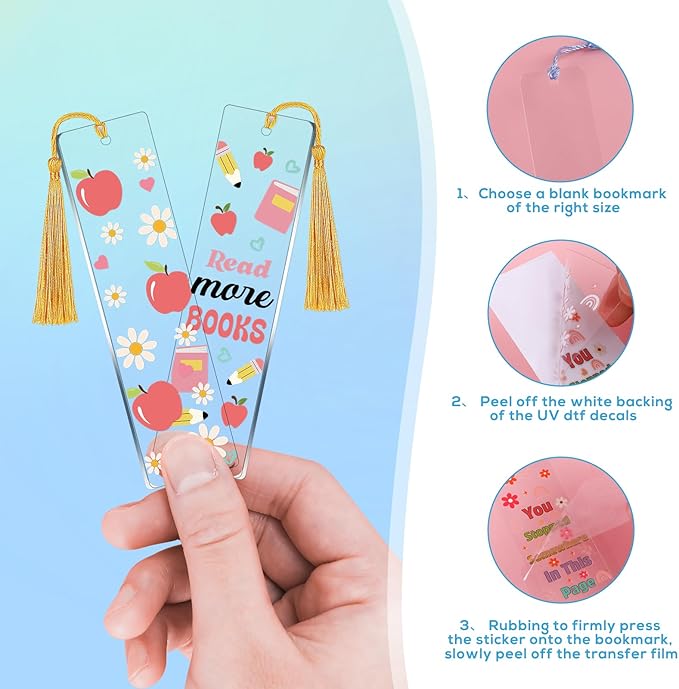 - Easy to Use: First choose the right size of blank acrylic bookmark, next remove the white backing of the stickers and stick them on the surface of the bookmark, rub to make sure the pattern is sticking on the bookmark, finally peel off the clear film, you will get a DIY creative bookmarks