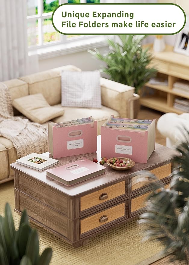 Accordion File Organizer, 12 Pockets Wheat Straw Expanding File Folders, Upright&Open Top, Monthly Bill Receipt Organizer, 100%BPA Free, Return to Nature, Healthy Living,Letter/A4 Size-Strawberry Pink