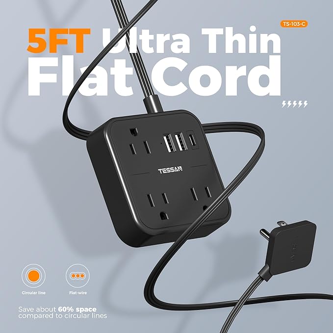 Surge Protector Power Strip, TESSAN Flat Extension Cord 5 FT with USB Ports (1 USB C) and 3 Outlets, Ultra Thin Flat Plug Wall Charger for Home, Office, School, Dorm Room Essentials, Black