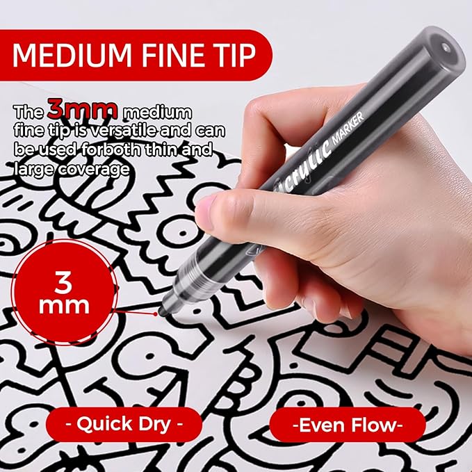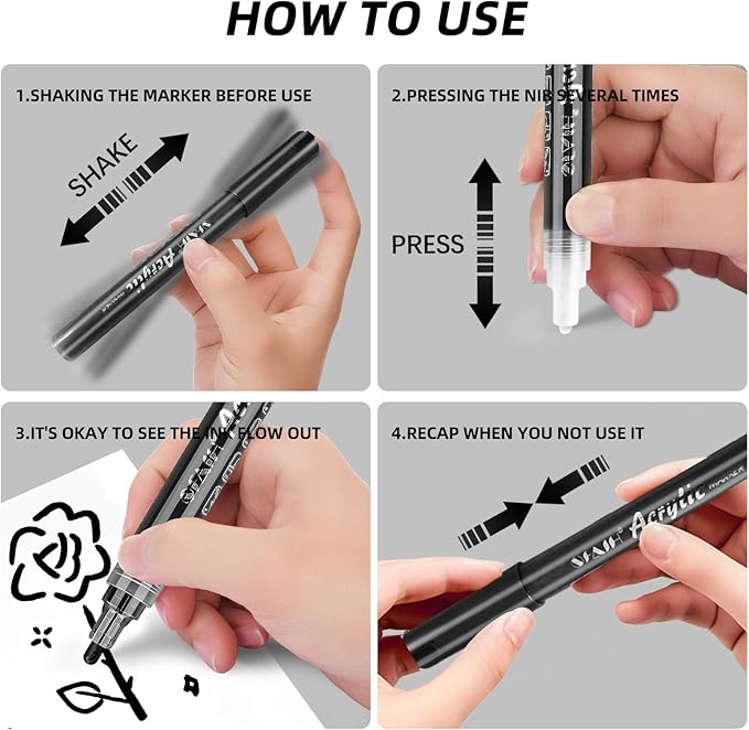 - WHY CHOOSE US: Compared with other acrylic paint pens, our black acrylic paint pens feature bright colors and strong coverage, which can easily cover darker colors and textures. Whether you are painting on various surfaces such as wood, rocks, glass, metal, ceramic, fabric, paper, and more. our black acrylic paint pens can help you show the best results.