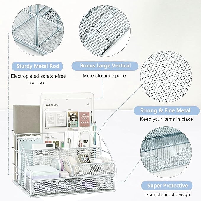 - Multifunctional Desk Organizers: With 5 separate compartments and 1 sliding drawer. Easily sort and organize pens, notes, calendars, and other office supplies, and can be used as a cosmetic organizer or stationery organizer. Office organizers for desk adopt a powder coat finish and electroplating technology, wear-resistant, anti-oxidation, and long-lasting, with the rounded corners metal rim to protect your desk.