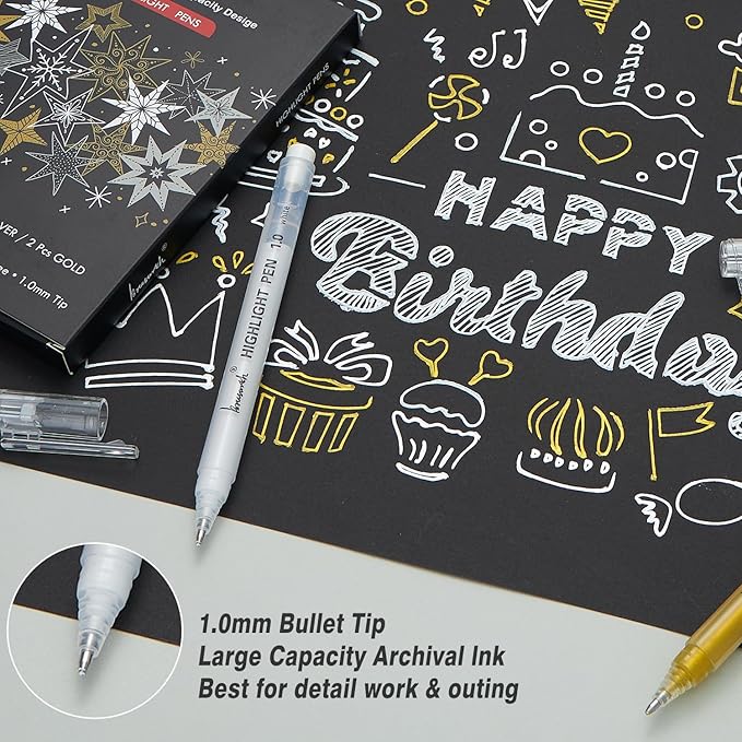 - FINE POINT WHITE GEL PENS: 3 Colors 1.0 mm fine point gel ink pens set. Package includes 4 White Gel Pen, 2 Gold Gel Pen, 2 Silver Gel Pen, You can use it for the coloured high-light part of the mark pen works