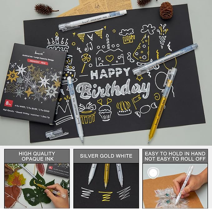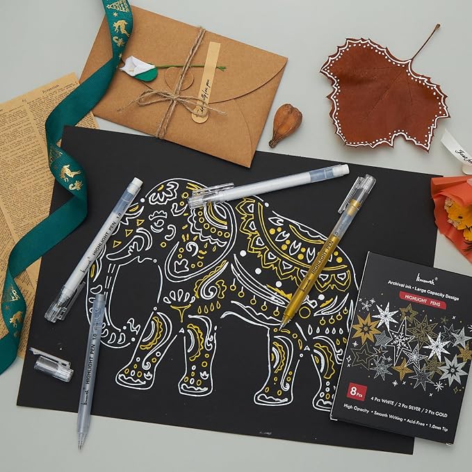 White Gold and Silver Gel Pen Set, 1mm Extra Fine Point Pens Gel Ink Pens Opaque Archival Ink Pens for Black Paper Drawing, Sketching,Card Making, Illustration, Bullet Journaling, 8 Pack