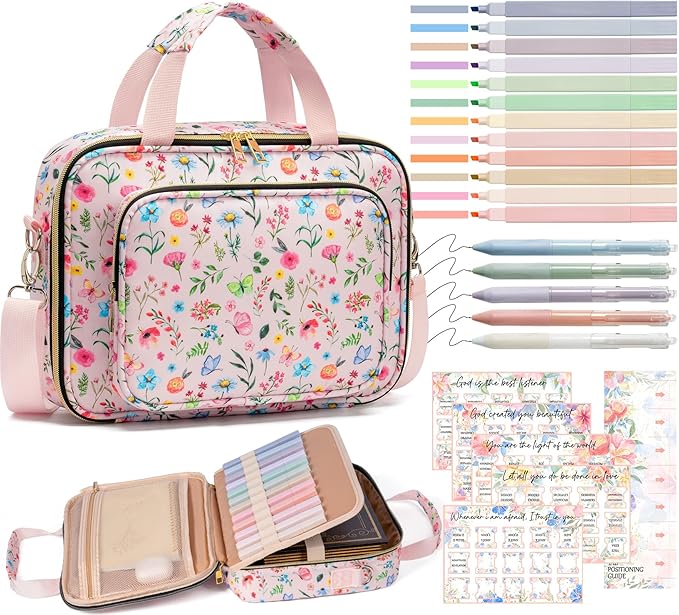 - ALL-IN-ONE SET: Along with the pink Bible cover case, you’ll also get 12 highlighters, 5 black gel pens, 75 Bible tabs and a tab positioning guide. This Bible Journaling Kit is designed to simplify your reading and note-taking process. Bible highlighters and pens no bleed, write smooth and dry quickly, help in your daily bible journaling without ruining your bible pages. With the alignment guide, applying Bible indexing sticky tabs has never been easier, making effortless scripture navigation