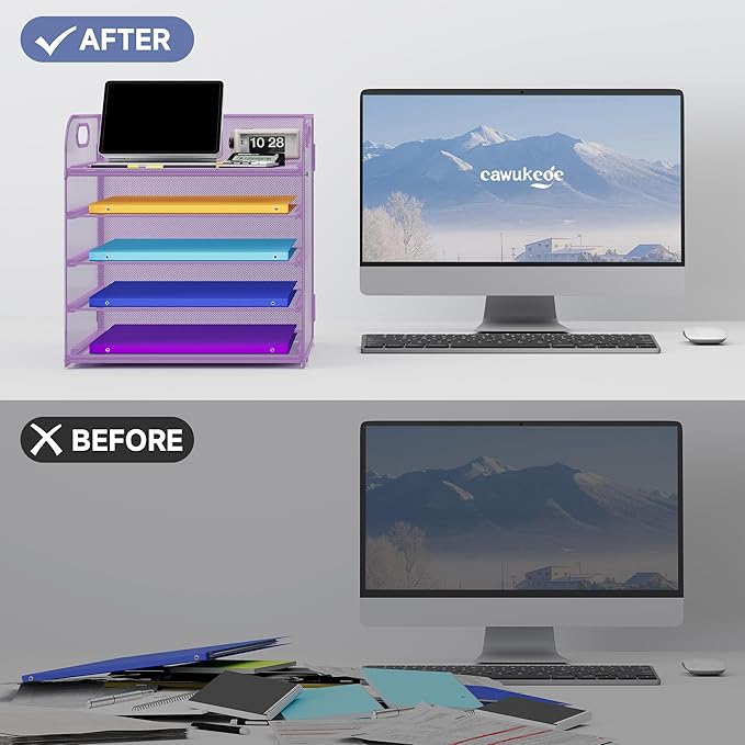 - 【EFFICIENT DESK ORGANIZER】Keep your desk tidy and clutter-free with our 5-Tier Paper Organizer with Handle. This file organizer provides ample space for sorting and storing papers, letters, documents, folders, books, magzines, staplers, caculators and sticky notes.