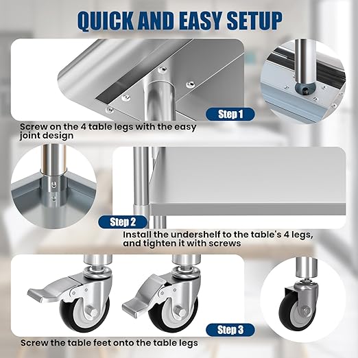 - Commercial Heavy Duty Worktable: NSF-certified, stainless steel table adopts a durable 430 stainless steel one-piece tabletop and a galvanized undershelf, ensuring superior resistance to wear and corrosion