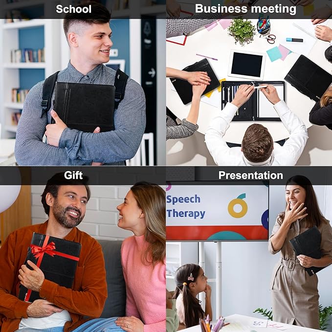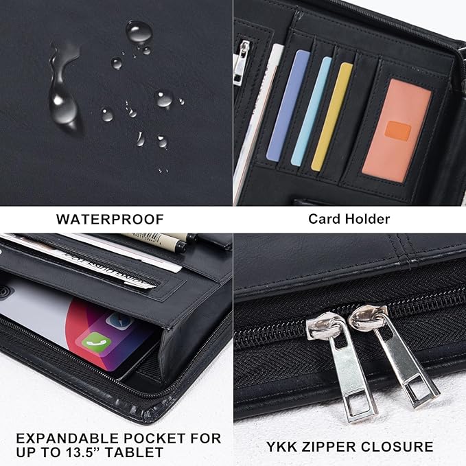 - [Padfolio with zipper]: The portfolio binder organizer is a PERFECT gift for business meetings, interviews, study for class and office work as a conference folder and tablet case for iPad etc. This is also a perfect and special Christmas / New Year gift for work colleagues, business clients, both men and women, friends and professors. Its elegance and professionalism are emphasised by the cowhide leather interior.
