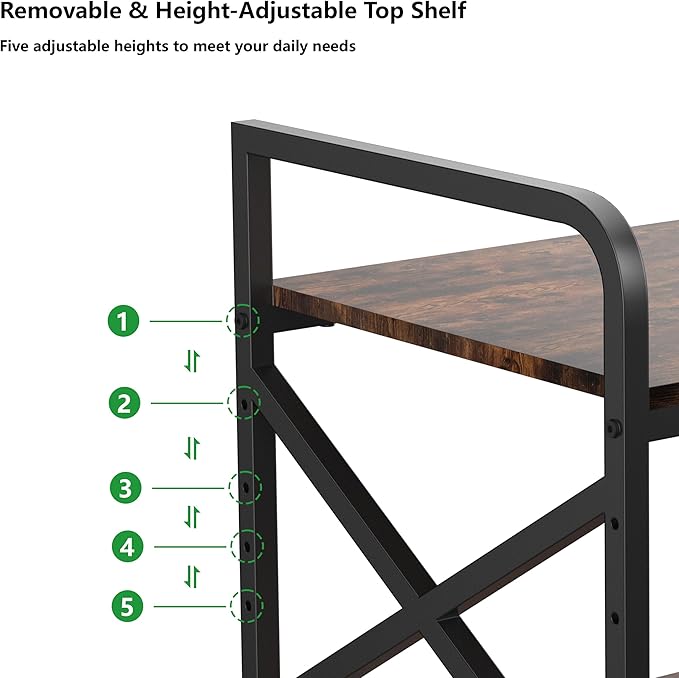 - Height Adjustable Top Shelf: The top shelf of this 2 tier printer shelf is removable and height-adjustable with 5 levels, so you can customize the space between top and bottom shelf with clear height 12.3in, 9.6in, 7.6in, or 5.6in to accommodate differently sized items. Experience the flexibility and versatility of customizable storage options with this innovative computer tower stand