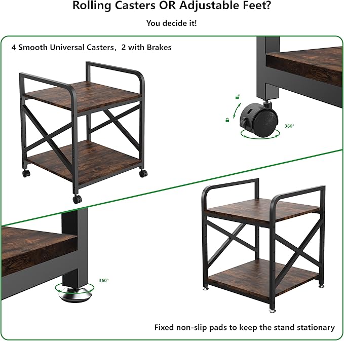 - Both Casters and Foot Pads are Included: The package of the 3D printer table comes with both foot pads and 360°rotate rolling casters so that you can either keep the home printer stands stationary with the feet or mount the casters to move the large printer stand around flexibly. Two of the four wheels are lockable to keep the printer cabinet in position. These foot pads can be fine-tuned to prevent wobbling on uneven ground to keep the printer desk secure