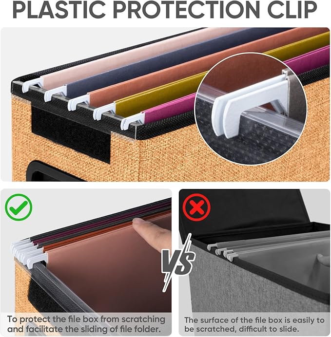 - [UNIVERSAL SIZE] Our file box with lid fits both letter and legal size files. It is designed for efficiency and functionality, with its smooth PVC slide rails on both sides, you can effortlessly slide file folders for easy access and neatly arranged. The lid can fit snugly on the box after hanging folders. (NOTE: file folders are not included)