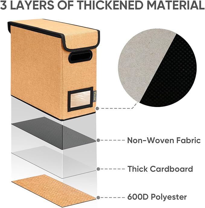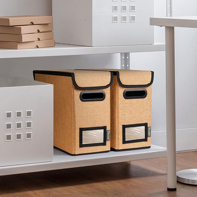 - [DURABLE MATERIAL] The outer layer of our filing box is crafted from high-quality polyester fabric and reinforced with thick cardboard in the middle. This construction ensures that the box maintains its shape and provides better bearing capacity for important documents and files. Its textured appearance can also serve as a stylish decorative element in any office or home