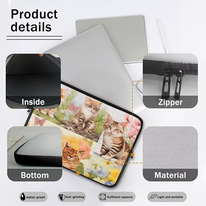 Cat Floral Printed Computer Case Bag for Girls Boys, Washable 10 Inch Laptop Bag Carrying Case Cute Laptop Briefcase Neoprene with Zipper, Compatible with Various Computers