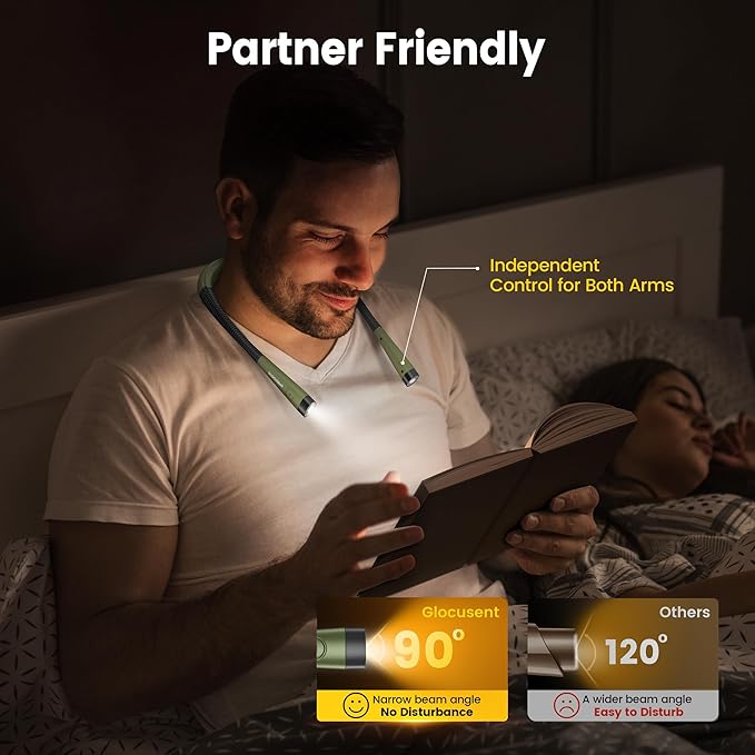 - [Partner Friendly & Versatile] Unlike other book lights for reading at night in bed, the Glocusent neck book light has a special narrow beam angle (90°) design. It is bright enough to illuminate the area you focus on while being dim enough not to disturb your sleeping partner. Additionally, the hands-free feature allows you to engage in various delicate activities such as knitting, walking, repairing, and more. Make it a perfect versatile book light.