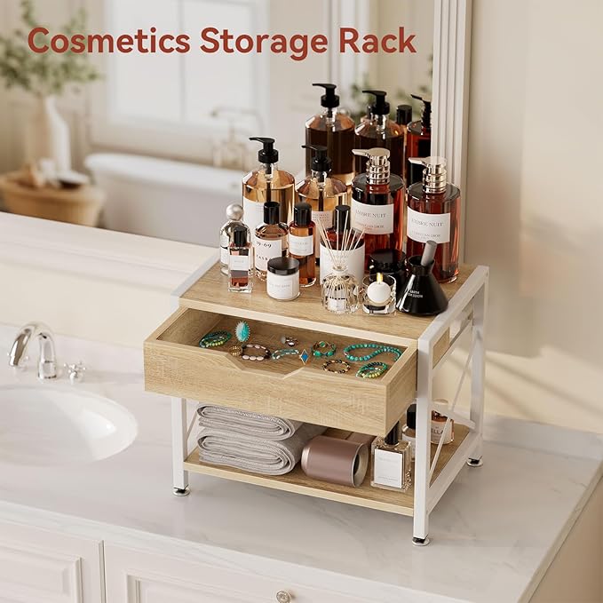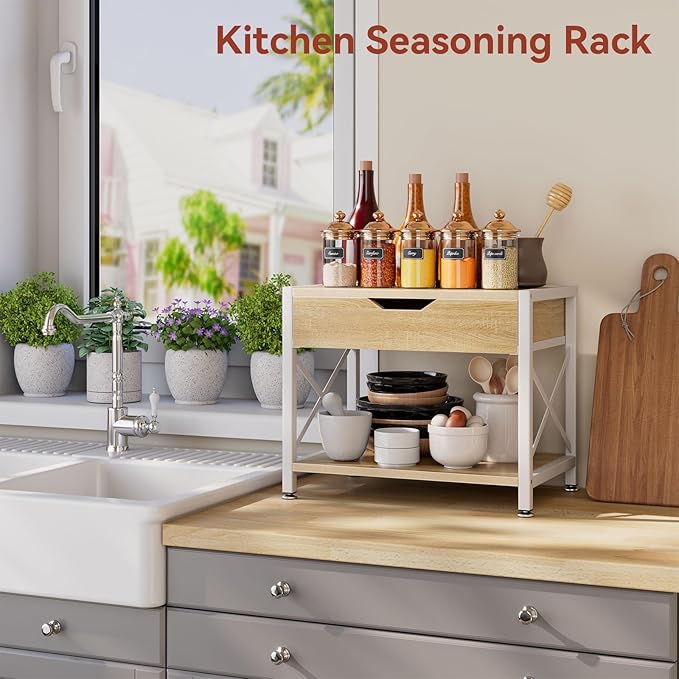 IBUYKE 2 Tier Desktop Printer Stand,Multi-Purpose Desk Organizer,Wooden Printer Stand with Drawer Storage for Folders,Books,for Fax Machine, Scanner,Home Office,Light Wood TLJ012R