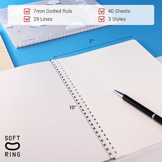 - Functional Dotted Line: Regular 7mm line spacing suitable for most work or study scenarios. The dots on the line are perfect for precise note-taking, detailed math or chemistry chart diagrams, artistic sketches, and student use. The 7mm line sapcing of Kokuyo ring notebook is only 0.1mm less than college ruled, the difference is small enough to be ignored