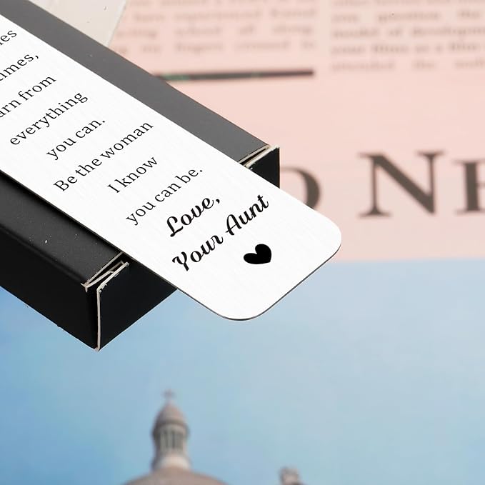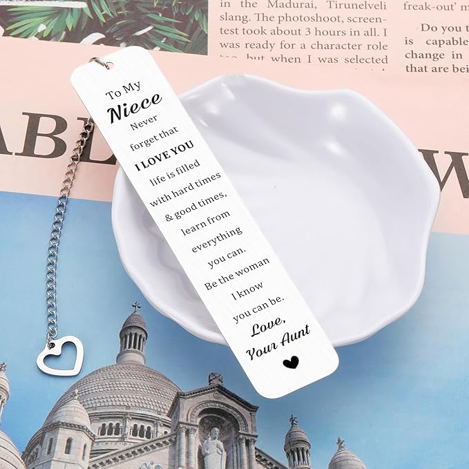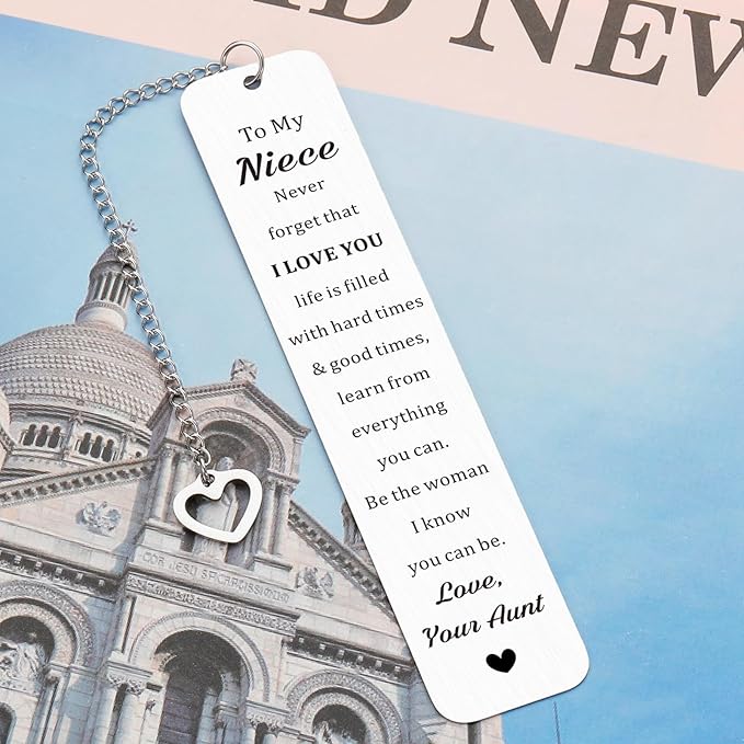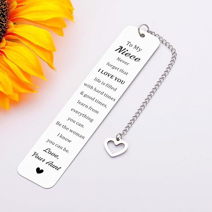 - 【What You Receive】 A metal bookmark (5.12*1.03*0.02 inch), a love accessory and a gift box. The stainless steel bookmark can be used for a long time and is a good companion gift for your niece. This daily reminder gift can turn into an advocate for your niece. After you receive it, you don't need to buy the packaging yourself, we have prepared a beautiful packaging box for you, and you can give it directly to your girl.