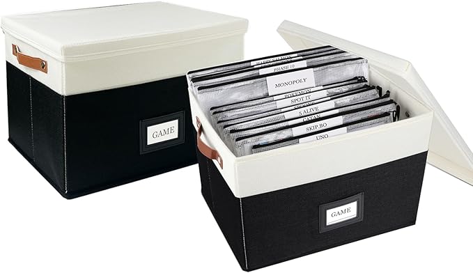 - Safe Storage: Board game organizer is made of extra-hard hollow board and linen,three-dimensional and beautiful, avoiding the storage from being squeezed.The top with lid prevents dust and can also be stacked to save space.The external PU label box makes the classification more organized and makes your storage worry-free and safe