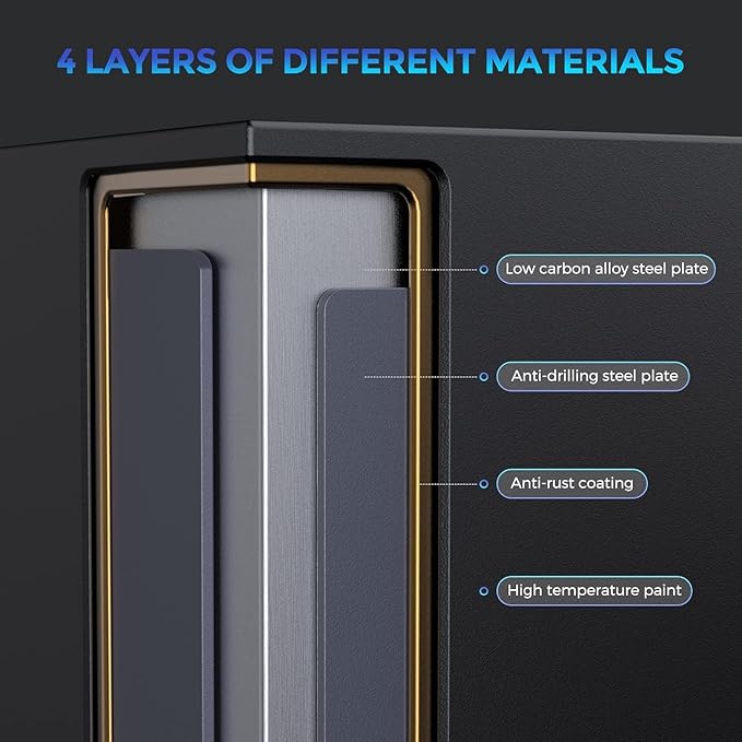 - Heavy Duty Safe: Fireproof safe is made of heavy duty steel plate, fully welded process, able to resist prying, smashing and high temperature, two 20mm all-steel bolts and pry-proof hidden keyhole, which are rust-proof and scratch-resistant. The surface is environmentally friendly sprayed and phosphating, and it has excellent wear resistance. The safe adopts full fusion welding technology and has a built-in moisture-proof circuit board.provide safe protection for your valuables