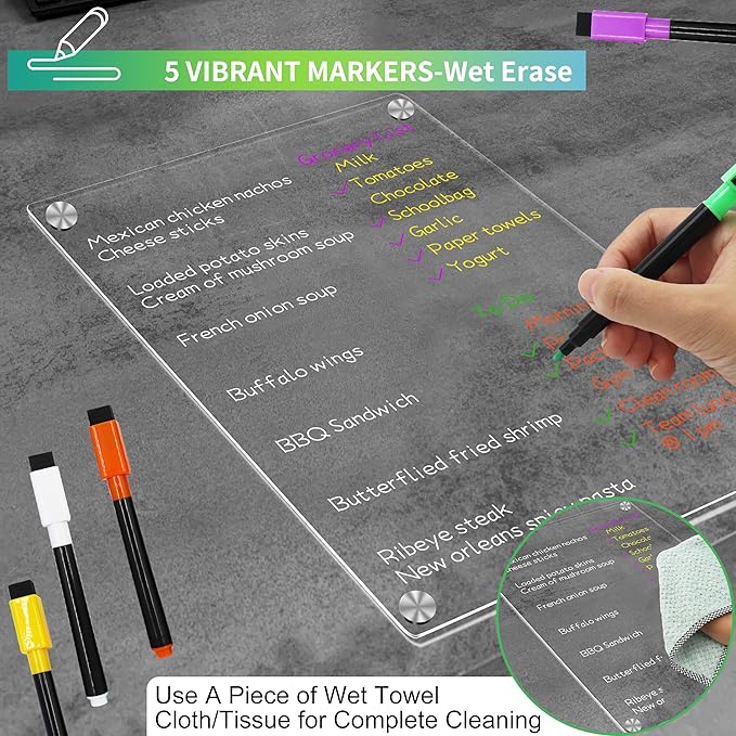 - [Anti-sliding & Anti-scratch & Sturdy Design] Dry erase board magnetic uses 4 extra strong magnets, which can be firmly attached to the refrigerator or various metal surfaces, with very strong grip. Clear dry erase board won't fall off or move easily unless manually. We also provide 5 wet erase markers with bright colors and 1 cleaning cloth.
