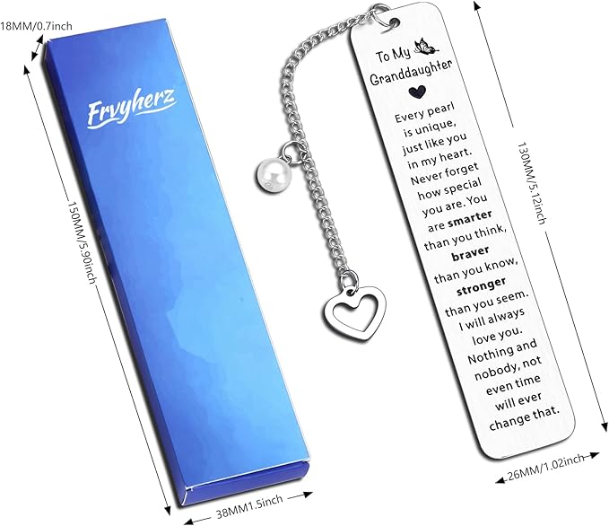 - To my granddaughter bookmark: to our granddaughter, sometimes she forget she is loved, so this is her wonderful reminder. Made of sturdy stainless steel, this bookmark size is 130*26mm, high-polished and won't rust or tarnish. Perfect for granddaughter christmas gifts, granddaughter stocking stuffers, granddaughter birthday gifts, to my granddaughter gifts, sweet 16 gifts for girl, valentines day gifts for granddaughter. To show our love, we can give this gift to our granddaughter at any time!
