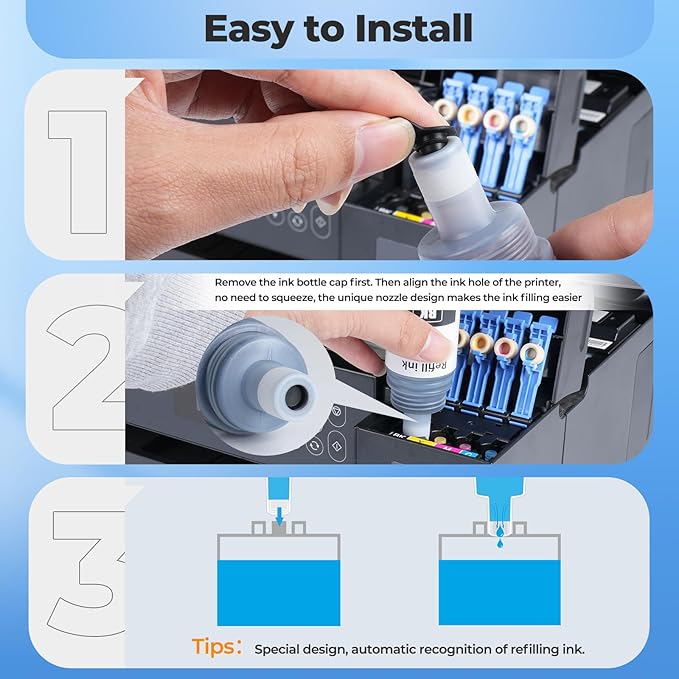 - Our 542 ink refill bottles has auto-stop nozzle design, easy filling, no spills, no drip, no need to squzze the ink bottles! Say goodbye to the hassle of manually squeezing and potentially spilling ink.