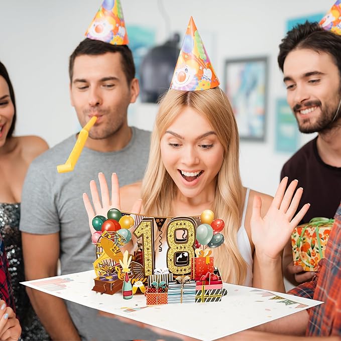- 18th Birthday Pop Up Card: This cute 18th birthday pop up card is mini-masterpiece displays a beautiful 3D pop-up design.It can be popped up of features “18” with balloons and gift box. Ideal Creative Gifts for party. Makes your birthday or anniversary party’s decorations stand out