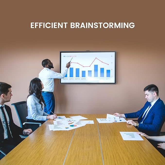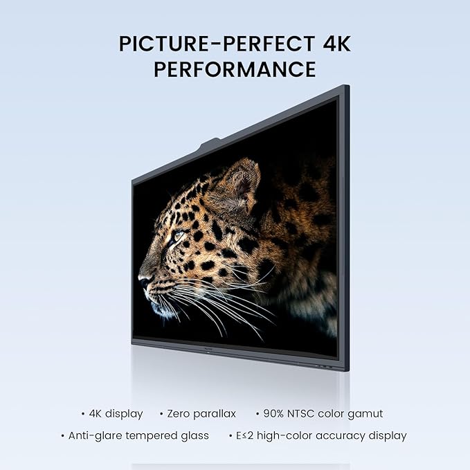 - Picture-Perfect 4K Performance:Experience clear visuals on the smart board with a 4K display and an extensive color gamut. The anti-glare tempered glass and zero-bonding technology aim to minimize parallax and air refraction, enhancing presentation clarity