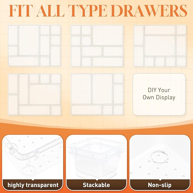 27 PCS Clear Plastic Drawer Organizers Set, 4-Size Versatile Bathroom and Vanity Drawer Organizer Trays, Storage Bins for Makeup, Bedroom, Kitchen Gadgets Utensils and Office