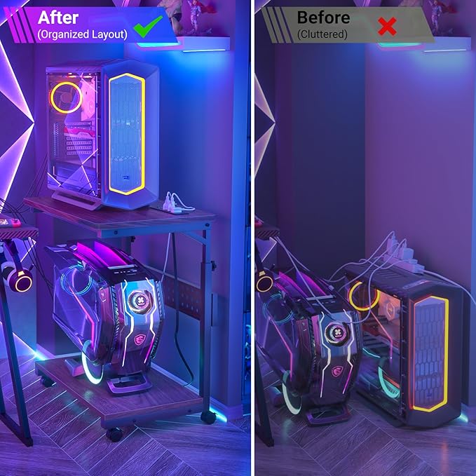 - Computer Tower Stand with Wheels - The stand has easy-rolling wheels that work great on the floors and would probably work great on the carpet as smooth running as they are. You can roll it to wherever you feel like working or gaming. All the wheels have locks. So it can stay in place when locked, whatever your cat constantly jumps on the tower.