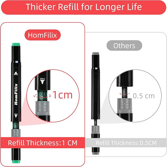 - [ Wider Refill ] - Each of HomFilix alcohol markers use wider refill, the width is around 1CM, it lasts longer compared with other alcohol pens, and you can add alcohol pigment independently, if you are not satisfied with our alcohol pens in any way, you are welcome to contact us at any time