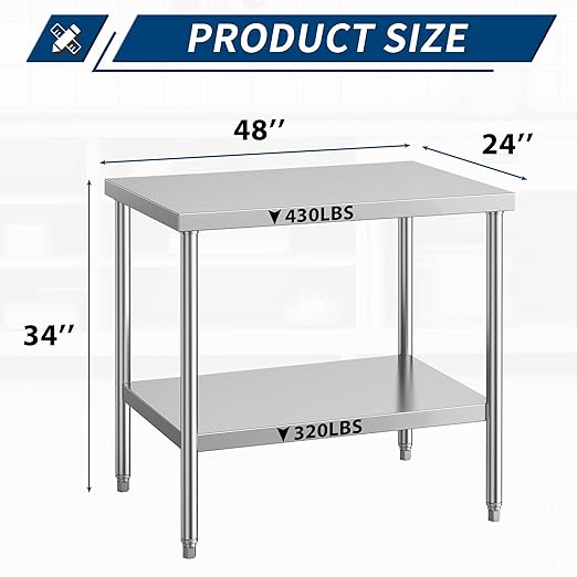 - LARGE WORK SURFACE: With a spacious 24 x 48 inch worktop, this table offers ample room for food preparation, cooking, serving, and more.