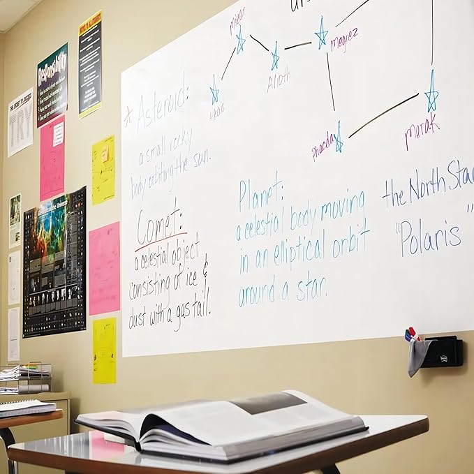 - Easy to stick: The self-adhesive whiteboard paper is very flexible and durable, with adhesive on one side, so it can be attached to any smooth surface. You can also stick the stickers on any smooth surface and use it as an educational board in a school classroom or a meeting board in the office, or stick it on the refrigerator at home as a notepad for lists. In addition, there is no need to drill holes, and more importantly, there is no chalk dust