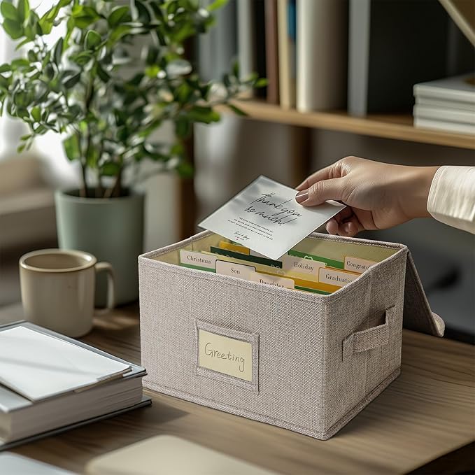 Vienrose Greeting Card Organizer Storage Box with 20 Removable Dividers, 84 Self-stick Labels, Perfect for Photos, Envelopes, Scrapbooking, Paper, Stickers Holder 1 Pack Beige