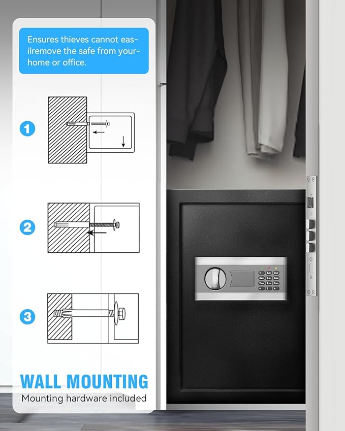 - [Secure Anchoring Design]: Pre-drilled holes and mounting hardware enable secure installation on walls, floors, or inside closets to further protect the safe from theft or unauthorized removal.