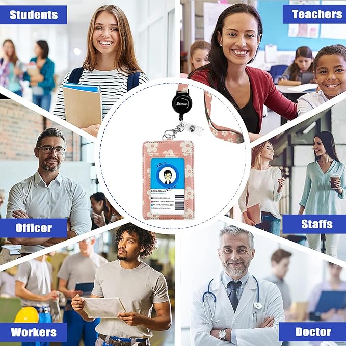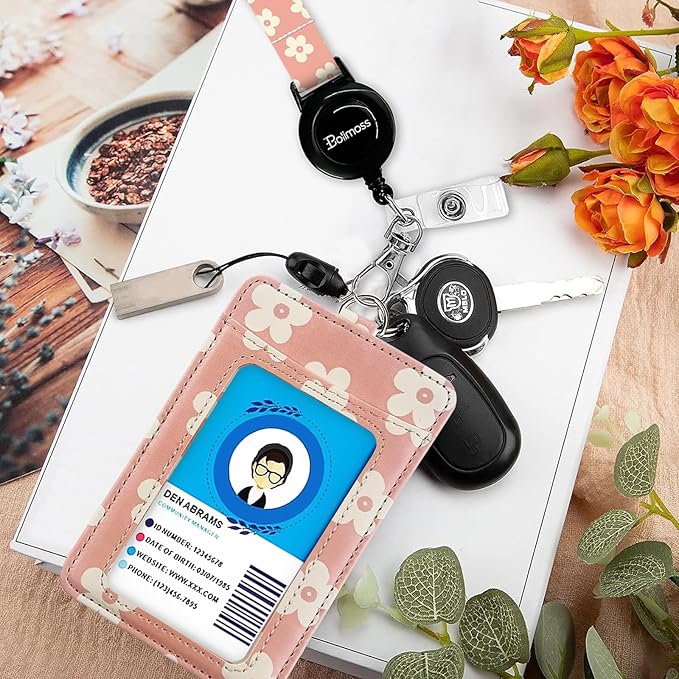 bolimoss Cute Leather Badge Holder and Adjustable Retractable Lanyards, Quick Release Buckle and Safety Breakaway Lanyards with Swivel Metal Clasp for Offices, Teacher, Student (Pink Groovy Flowers)