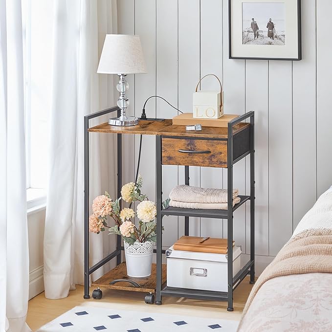 HOOBRO Printer Stand with Charging Station, Printer Shredder Stand with Fabric Drawer, Table for Fax Machine, Printer Storage Office Organizer, for Home Office, Rustic Brown and Black BF72UPS01