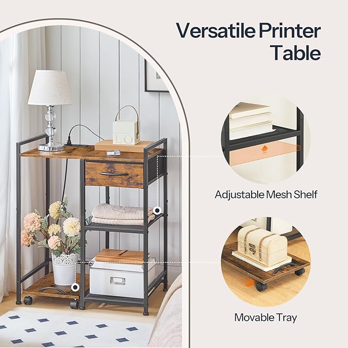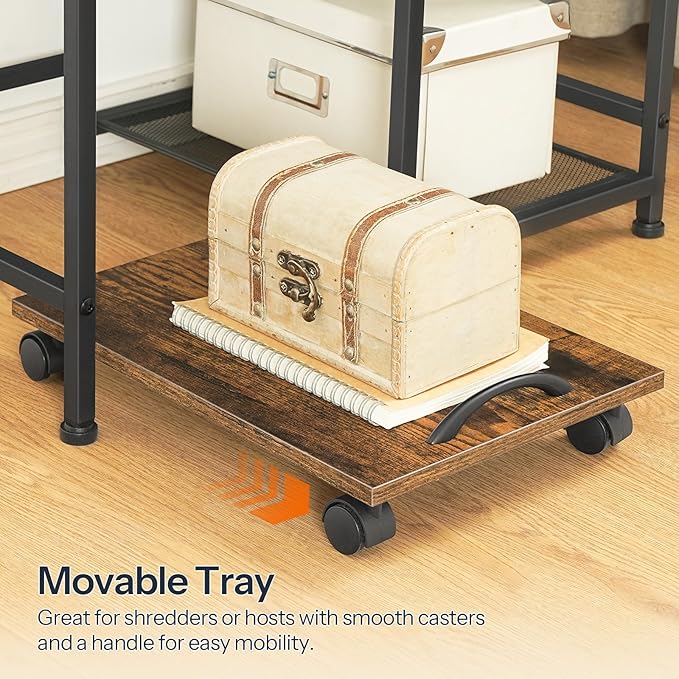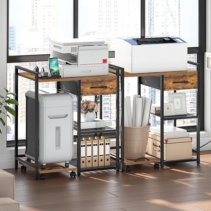 - Spacious Storage: Sized 23.2''L x 15.0''W x 28.5''H, the printer stand comes with a non-woven fabric drawer, 2 open shelves with adjustable middle shelf to fit items of varying sizes, and a movable tray ideal for shredders, PC towers, and other office equipment