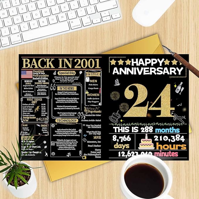 Joycard 24th Anniversary Card for Women Men, Gold Wedding Card for Wife Husband, Sweet Marriage Decorations Gifts for Couple, Perfect for Her Him on Anniversary Day, Back in 2001