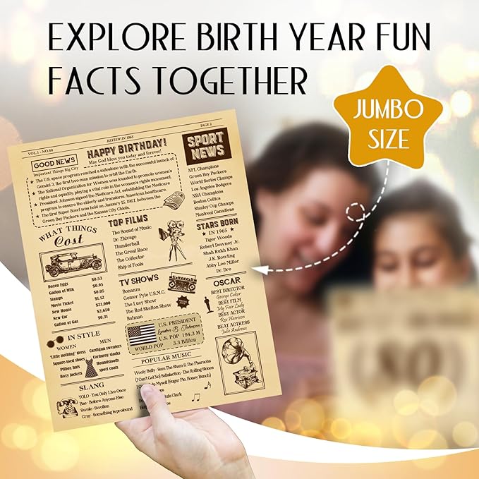- ✨Best 60th Birthday Card - If you are looking for a gift for friends and families who are going to celebrate a 60th birthday, This jumbo 60th card is filled with interesting facts from 1965. It has an antiqued paper background