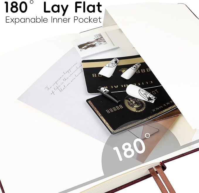 - 🗃️180°Lay Flat Design: The classic lined notebook can be laid flat and fully spread out 180° without hindering your writing, widened elastic closure band, which can be closed tightly to protect your contents, making writing easier for both right and left-handed users, which make the best use of your writing space.