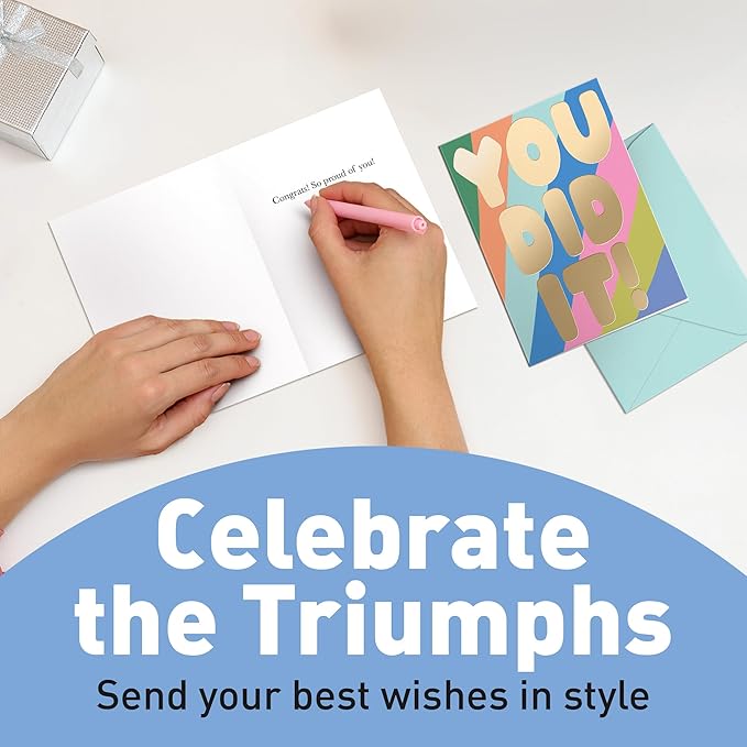 - Elevate Your Message — This set of 24 congratulations cards bulk pack is designed with a smooth, glossy exterior in 8 unique designs with gold foil. The interior surface is matte for easy writing with no ink bleed. Each sturdy proud of you card is 300gsm with 140gsm envelopes in four different colors. This enhances the presentation of the card, making it suitable for special occasions and important messages.