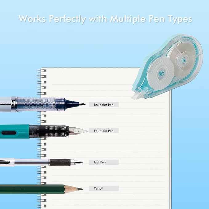 - Our correction tape set works perfectly with fountain pens, gel pens, ballpoint pens, and pencils,the smooth, matte white surface of the tape ensures quick-drying ink with no smudging or fading, so your corrections stay clear and precise.whether you're jotting down notes, completing assignments, or crafting creative projects, our correction tape enhances your writing experience by providing reliable and smooth corrections every time.