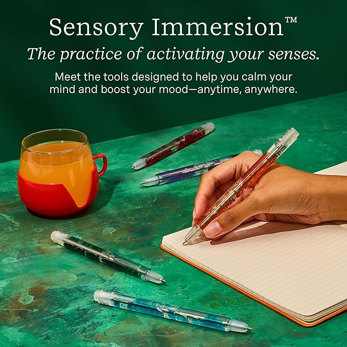 - Scented Ink: Each pen has a unique, invigorating scent from our Essential Oil Blends; the blue pen features notes of mint and grapefruit, and the green pen features notes of eucalyptus, fir needle, and pine.
