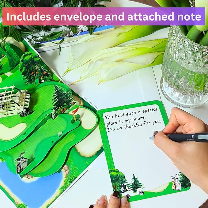 - ENVELOPE AND NOTES INCLUDED: The Golf pop up card is 6 x 8 inches and comes with a white envelope for easy mailing. In addition, the card also has a note card designed to slide out for easy message writing.